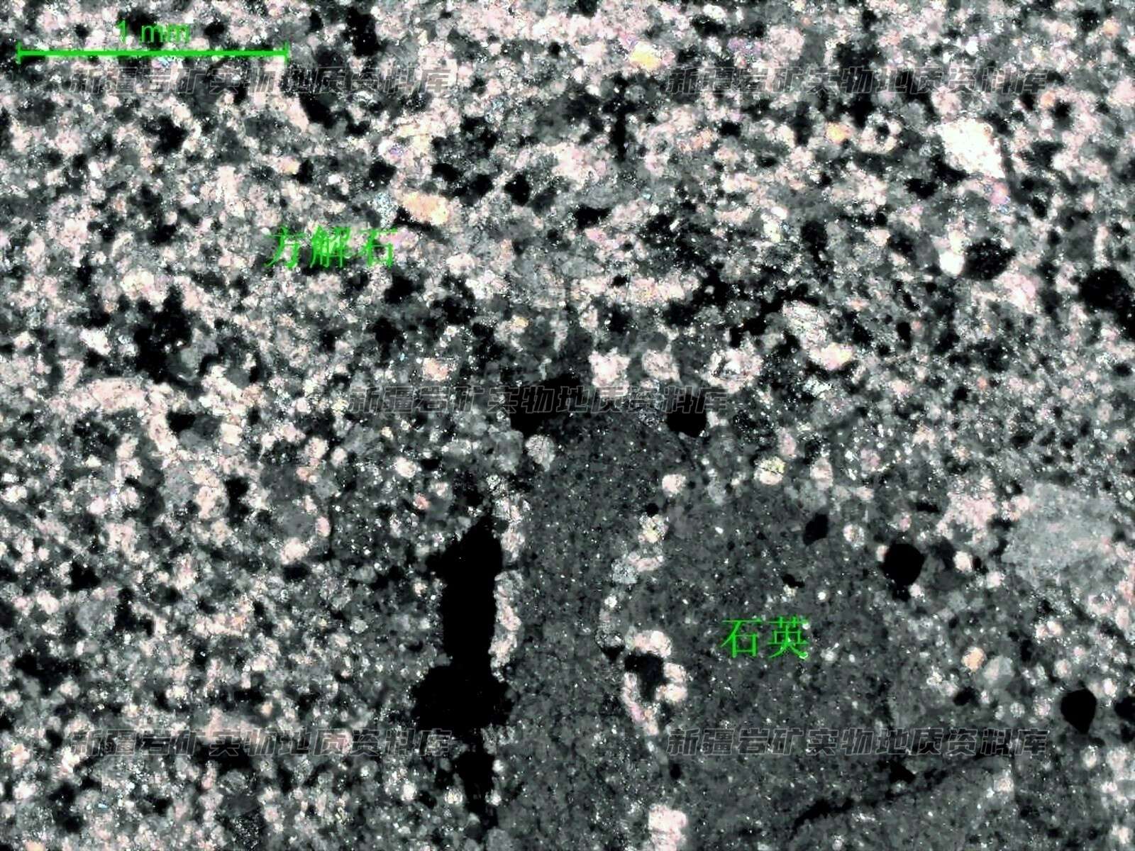 岩石特征描述: 岩石具显微-细粒粒状变晶结构,块状构造、条带状构造,主要由变晶方解石为主。方解石半自形-他形粒状,粒径0.05-0.4mm左右,紧密堆积,粒间界限较为清晰,含量94%;见少量石英颗粒,他形粒状、椭圆状,粒径多为1-4mm,多熔蚀,含量约5%;偶见自形黄铁矿零星分布。