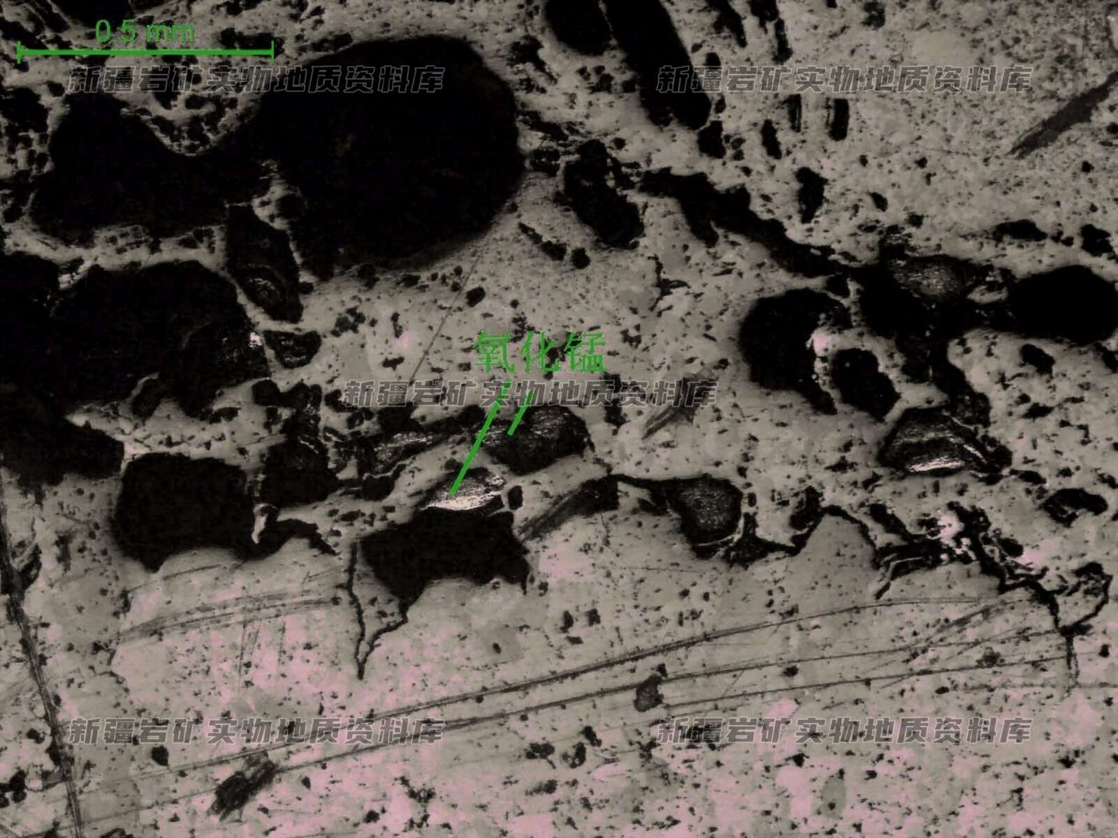 少见氧化锰矿物呈环带状、结核状。电子探针能谱确认。