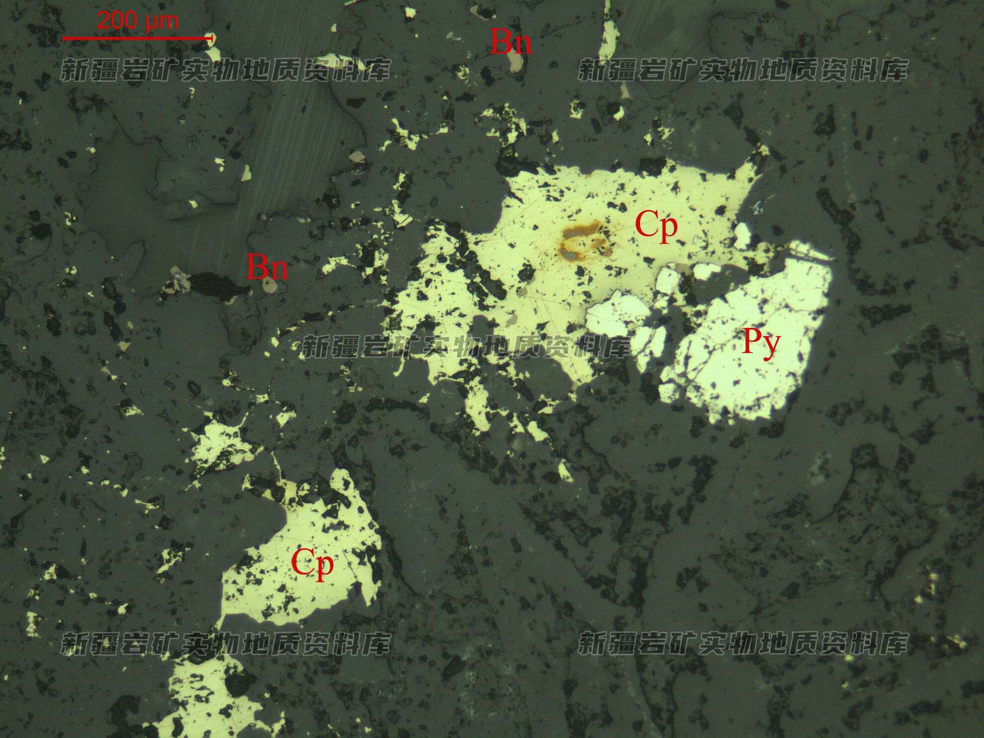 岩石特征描述: 金属硫化物黄铜矿(Cp)呈他形粒状、团粒状不均匀分布。斑铜矿(Bn)他形粒状,多分布在透明矿物粒间。黄铁矿(Py)半自形-他形粒状,与黄铜矿连生。
