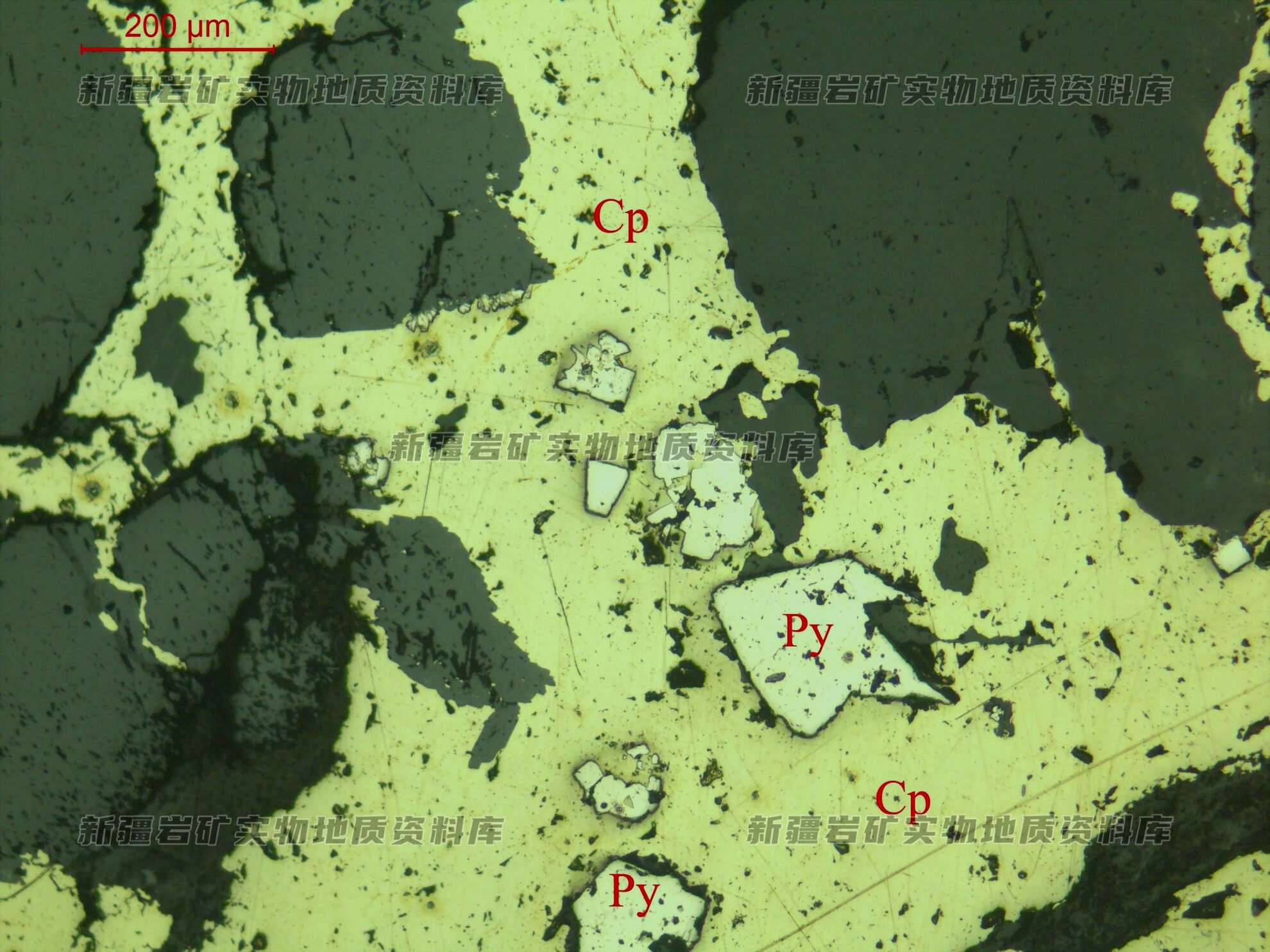 岩石特征描述: 金属硫化物黄铜矿(Cp)呈他形粒状、团粒状不均匀分布。黄铁矿(Py)半自形-他形粒状,分布在黄铜矿集合体中并被黄铜矿交代。