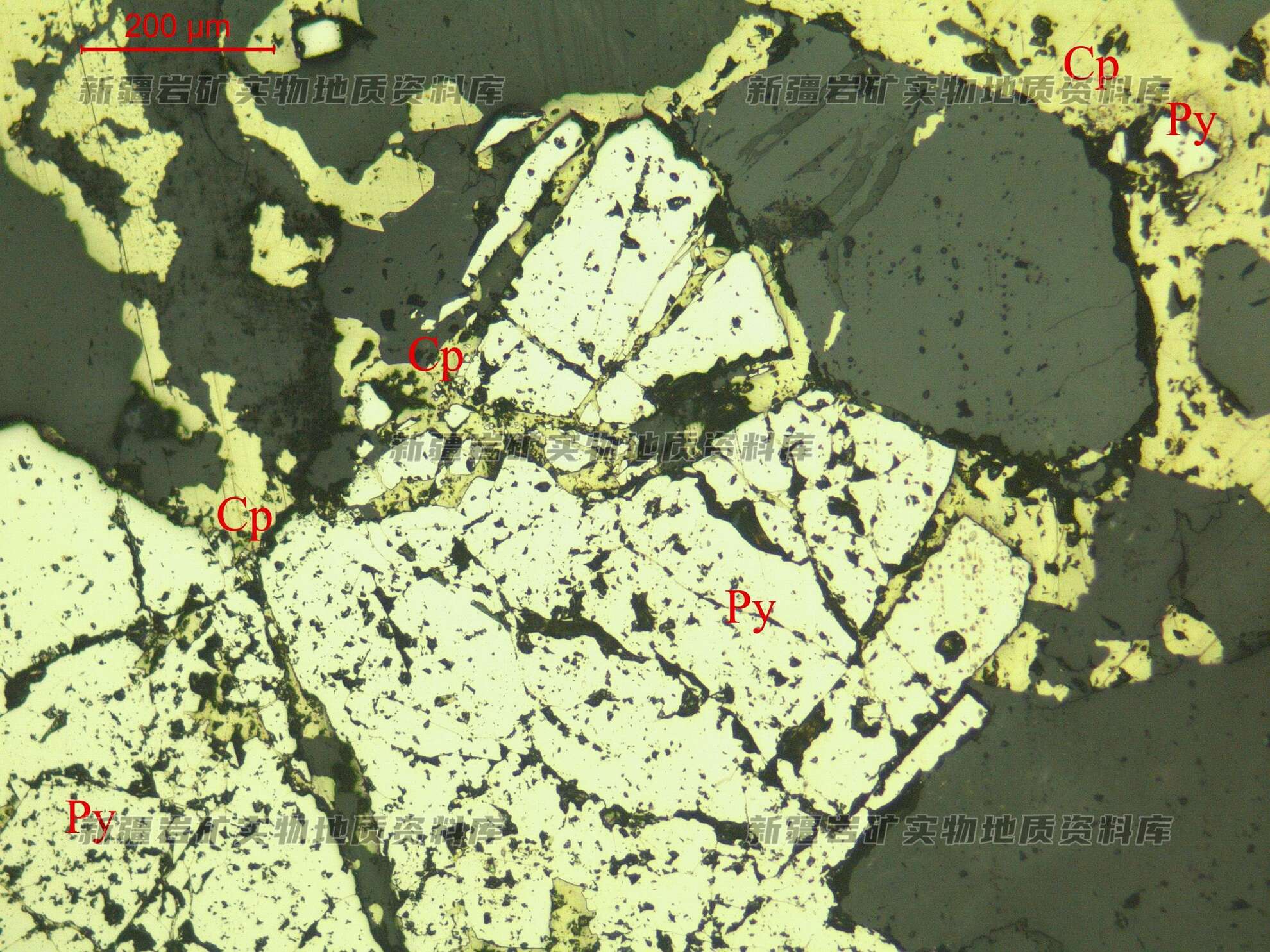 岩石特征描述: 金属硫化物黄铜矿(Cp)沿早阶段形成粗粒黄铁矿(Py)粒间、微裂隙分布并交代黄铁矿。