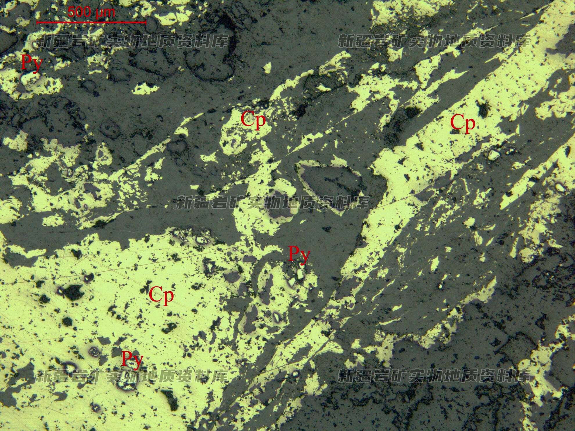 岩石特征描述: 金属硫化物黄铜矿(Cp)呈他形粒状、团粒状、脉状不均匀分布。黄铁矿(Py)半自形-他形粒状,分布在黄铜矿集合体中并被黄铜矿交代。