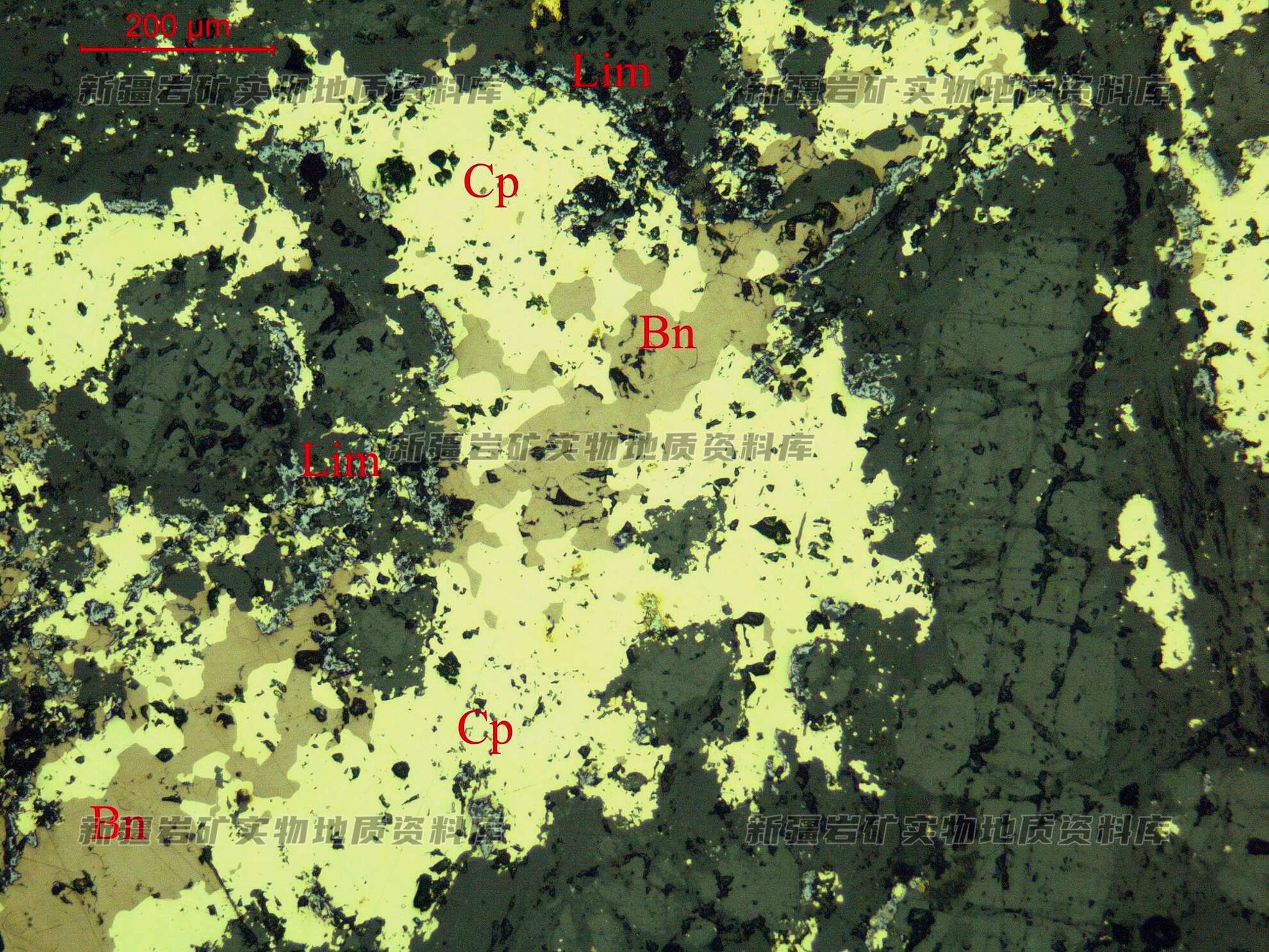 岩石特征描述: 金属硫化物黄铜矿(Cp)呈他形粒状、团粒状不均匀分布,褐铁矿(Lim)交代黄铜矿。斑铜矿(Bn)他形粒状,与黄铜矿连生并被褐铁矿交代。