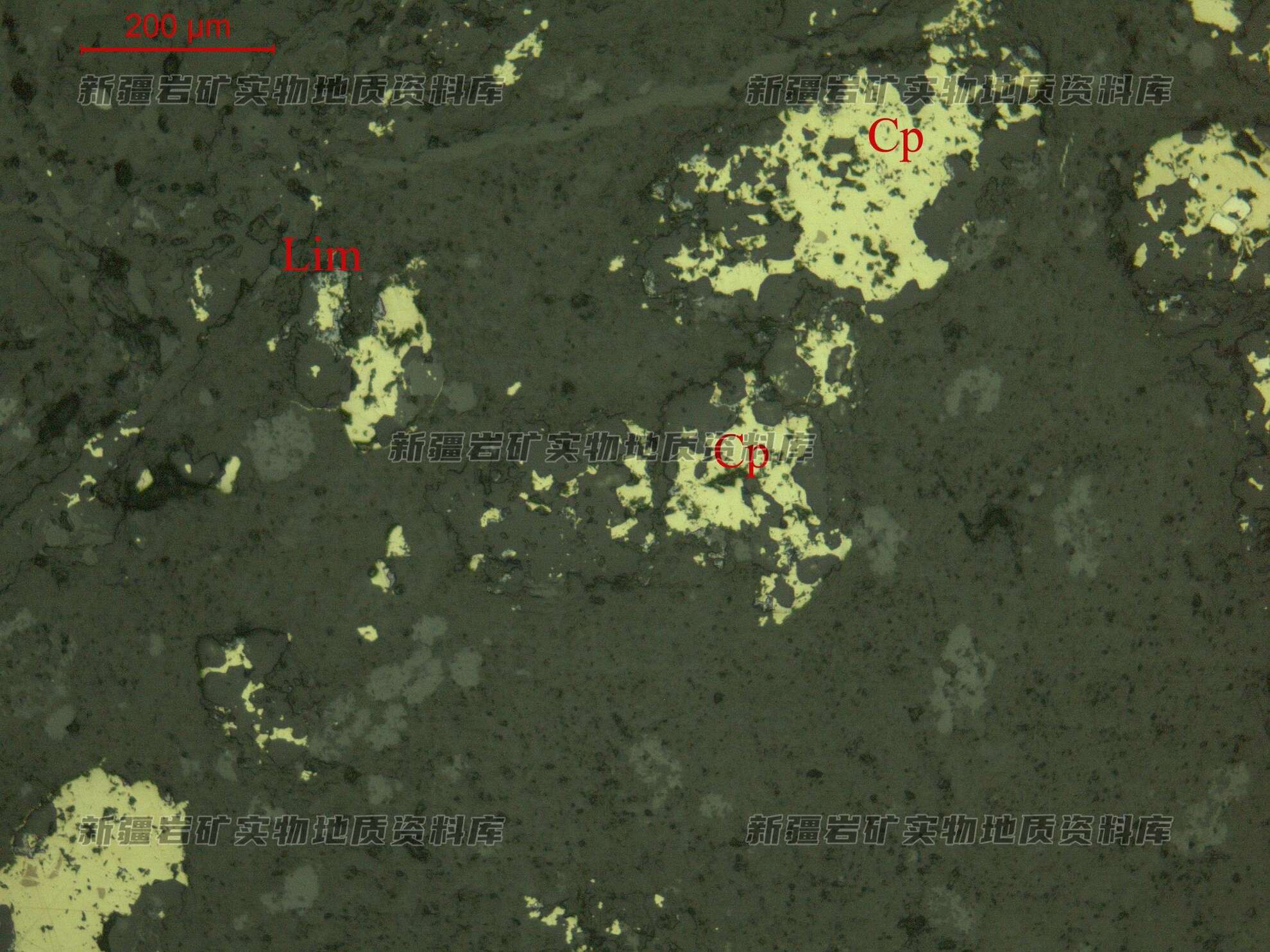 岩石特征描述: 金属硫化物黄铜矿(Cp)呈他形粒状、团粒状不均匀分布或呈单晶粒分布在透明矿物粒间并被次生褐铁矿(Lim)沿边缘交代。