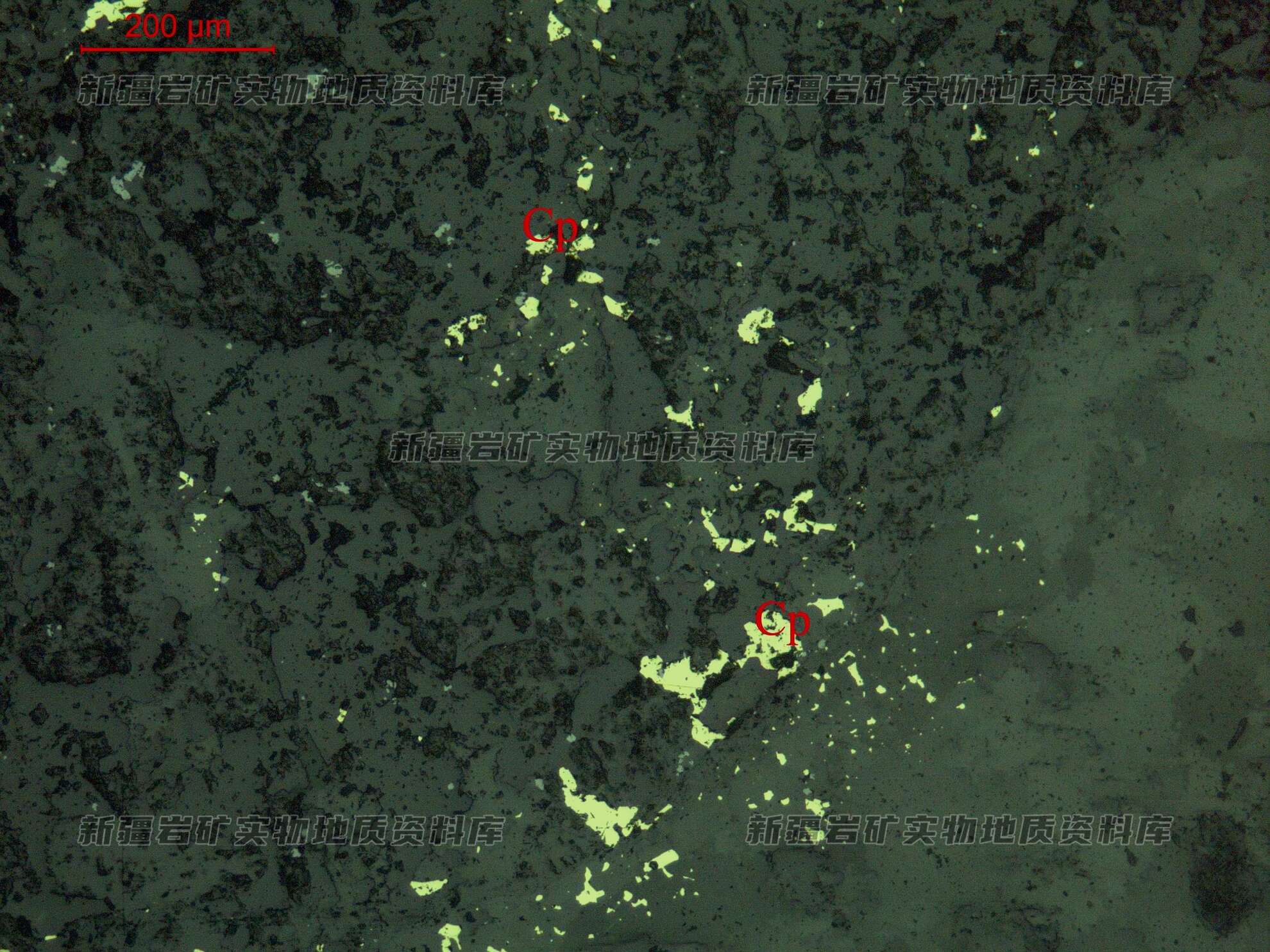 岩石特征描述: 金属硫化物黄铜矿(Cp)呈他形粒状,不均匀浸染分布在脉体和蚀变围岩中。