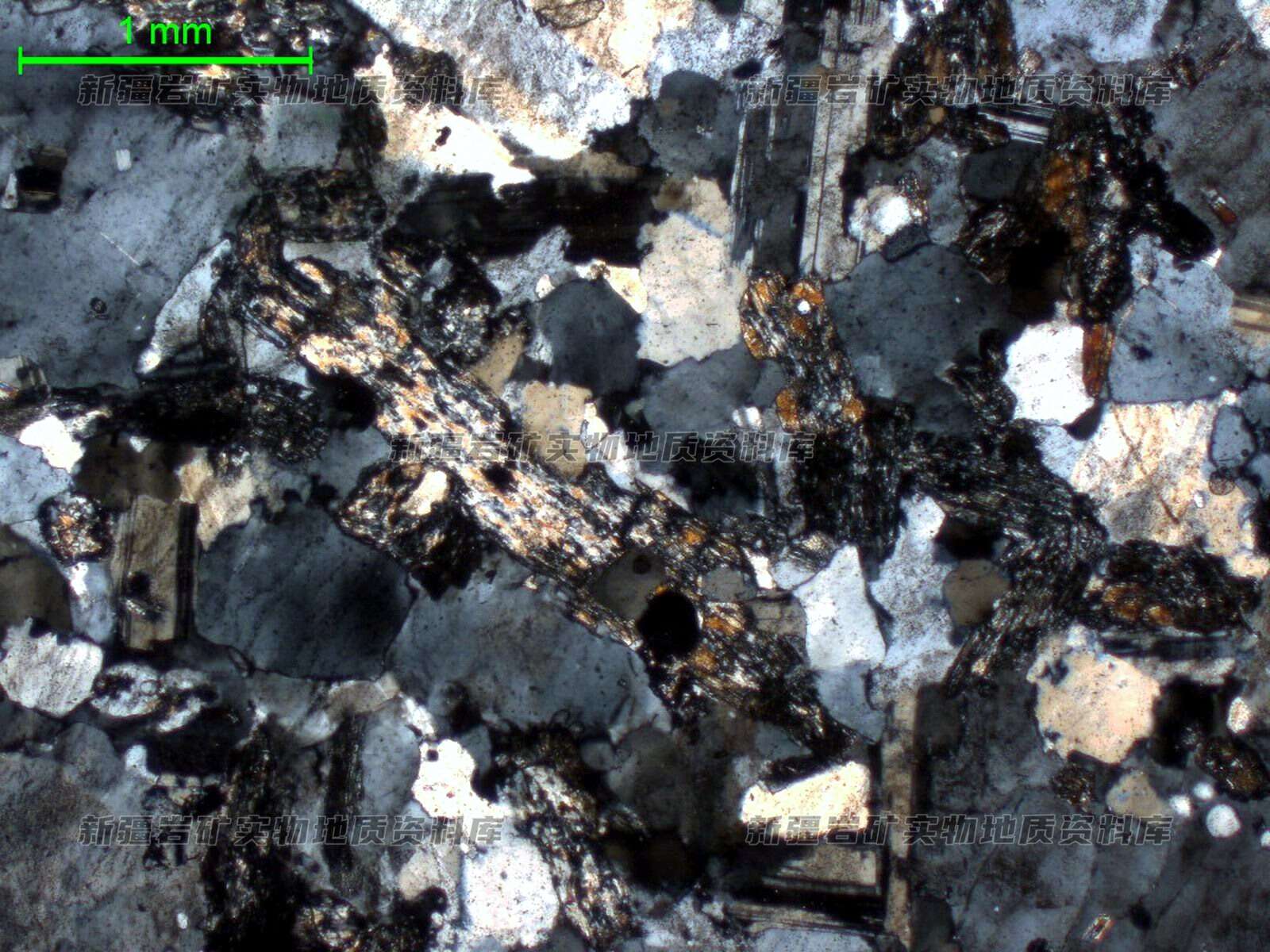 薄片中可见,长石含量多,斜长石和碱性长石含量相当,斜长石呈半自形板状,粒径0.2-4mm,具聚片双晶,根据电子探针能谱数据可知,以钠长石为主,含量约30%;碱性长石粒径变化大,部分结晶较粗,粒径0.1-3.2mm,常呈他形粒状、填隙状或半自形板状分布,双晶多不可见,表面轻微泥化,含量约35%;石英呈他形粒状、填隙状,粒径0.05-2mm,可见裂纹,常具波状消光,含量约20%;辉石呈半自形柱粒状,粒径0.1-2mm,单偏下无色,解理发育,含量约13%,根据来样化学分析结果,结合镜下特征,判断为锂辉石,因电子探针无法测Li元素,对其测试结果显示除锂元素以外的归一化结果,也与锂辉石成分特征符合。此外,可见个别白云母,呈叶片状,粒径0.2-0.5mm,结合共生矿物及电子探针数据,推测可能为锂云母或锂白云母;石榴石偶见,均质性,单偏下微带褐色调,他形粒状,内部包裹细小的长英质矿物;磷灰石呈半自形-他形粒状,粒径0.1-0.5mm,表面干净无蚀变,含量约1%;铌钽铁矿为岩石中的副矿物之一,粒径细小,呈针柱状、细小柱粒状,分布在透明矿物粒间、粒内。