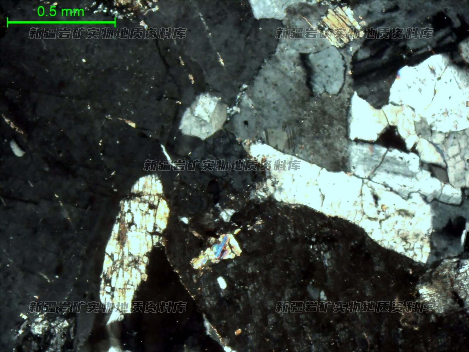 薄片中可见,长石含量多,斜长石和碱性长石含量相当,斜长石呈半自形板状,粒径0.2-4mm,具聚片双晶,根据电子探针能谱数据可知,以钠长石为主,含量约30%;碱性长石粒径变化大,部分结晶较粗,粒径0.1-3.2mm,常呈他形粒状、填隙状或半自形板状分布,双晶多不可见,表面轻微泥化,含量约35%;石英呈他形粒状、填隙状,粒径0.05-2mm,可见裂纹,常具波状消光,含量约20%;辉石呈半自形柱粒状,粒径0.1-2mm,单偏下无色,解理发育,含量约13%,根据来样化学分析结果,结合镜下特征,判断为锂辉石,因电子探针无法测Li元素,对其测试结果显示除锂元素以外的归一化结果,也与锂辉石成分特征符合。此外,可见个别白云母,呈叶片状,粒径0.2-0.5mm,结合共生矿物及电子探针数据,推测可能为锂云母或锂白云母;石榴石偶见,均质性,单偏下微带褐色调,他形粒状,内部包裹细小的长英质矿物;磷灰石呈半自形-他形粒状,粒径0.1-0.5mm,表面干净无蚀变,含量约1%;铌钽铁矿为岩石中的副矿物之一,粒径细小,呈针柱状、细小柱粒状,分布在透明矿物粒间、粒内。