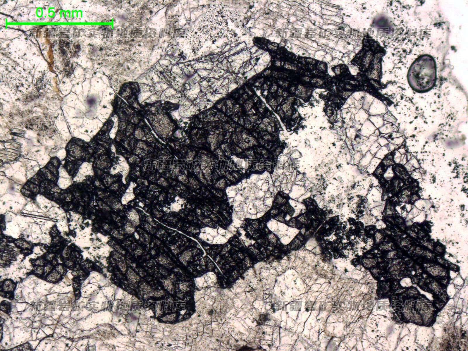 岩石特征描述: 单偏下可见石榴石晶粒,呈他形粒状,粒径稍粗,单偏下浅褐色调,正交偏光下全消光显示均质性,内部常被细小的透明矿物交代。