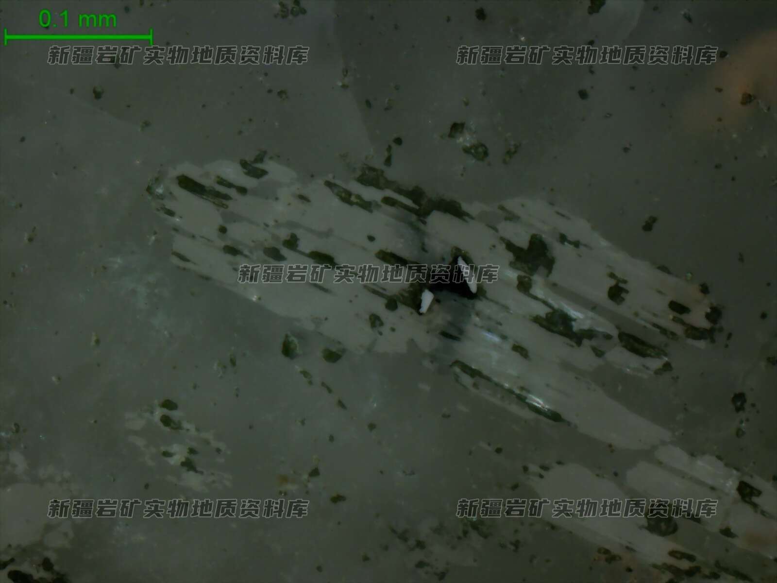 局部可见铌钽铁矿分布在锂辉石晶粒内,粒径细小,呈半自形柱粒状。
