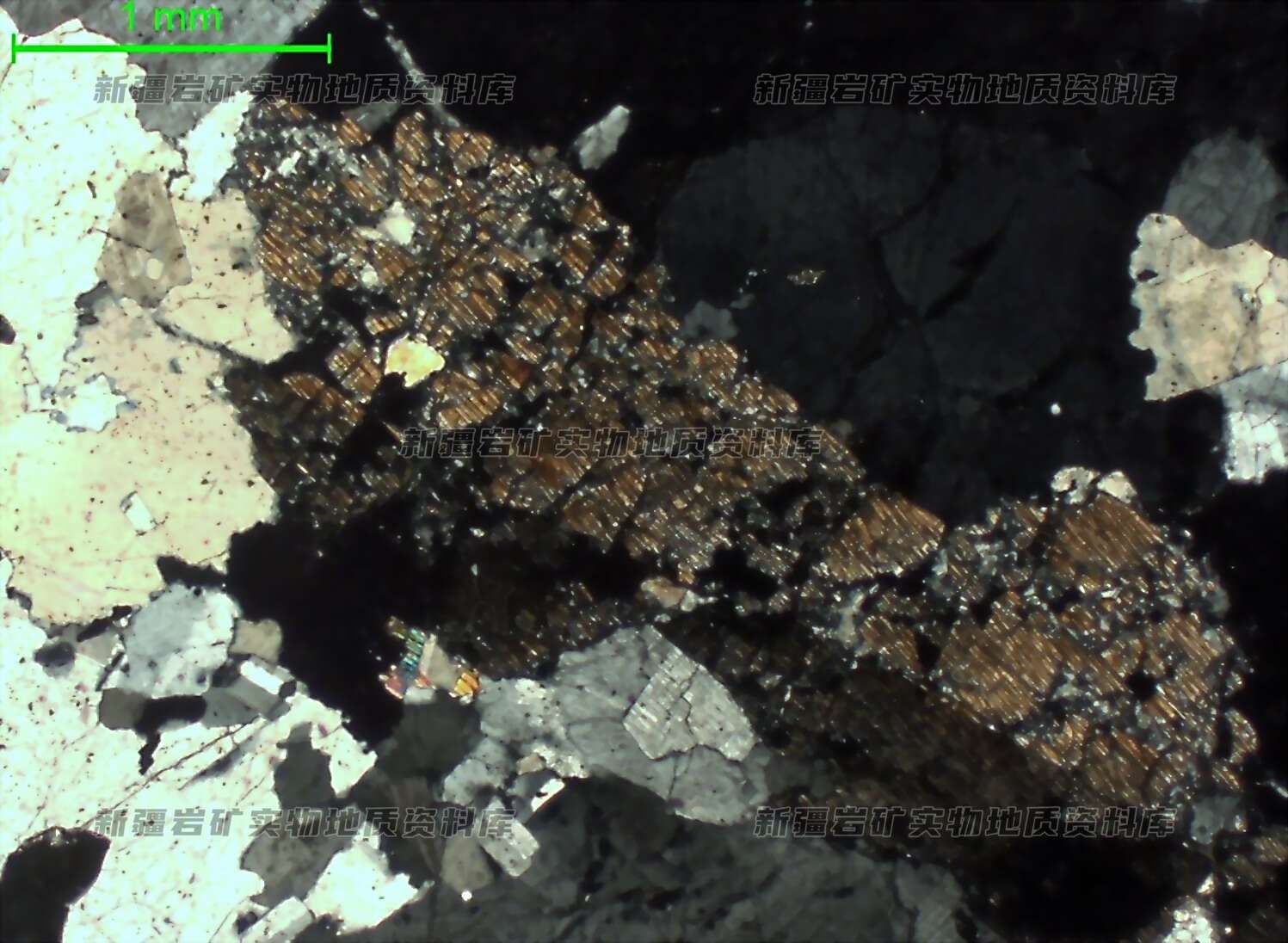 主要矿物及含量%: 薄片中可见锂辉石呈半自形柱状,粒径较粗,解理发育,可见简单双晶,多碎裂,包裹长英质矿物。