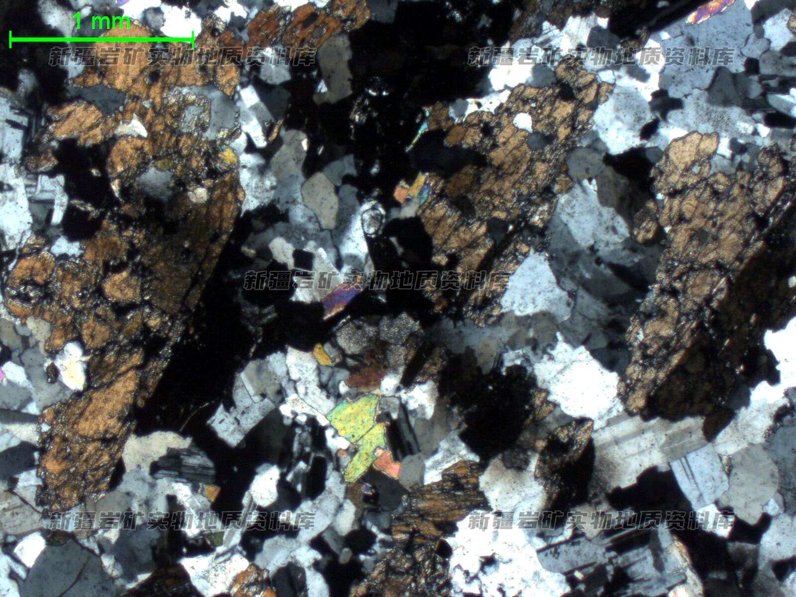主要矿物及含量%: 样品中部分锂辉石结晶稍粗,呈半自形柱状,简单双晶发育,多碎裂或被长英质矿物交代,其间分布少量云母。