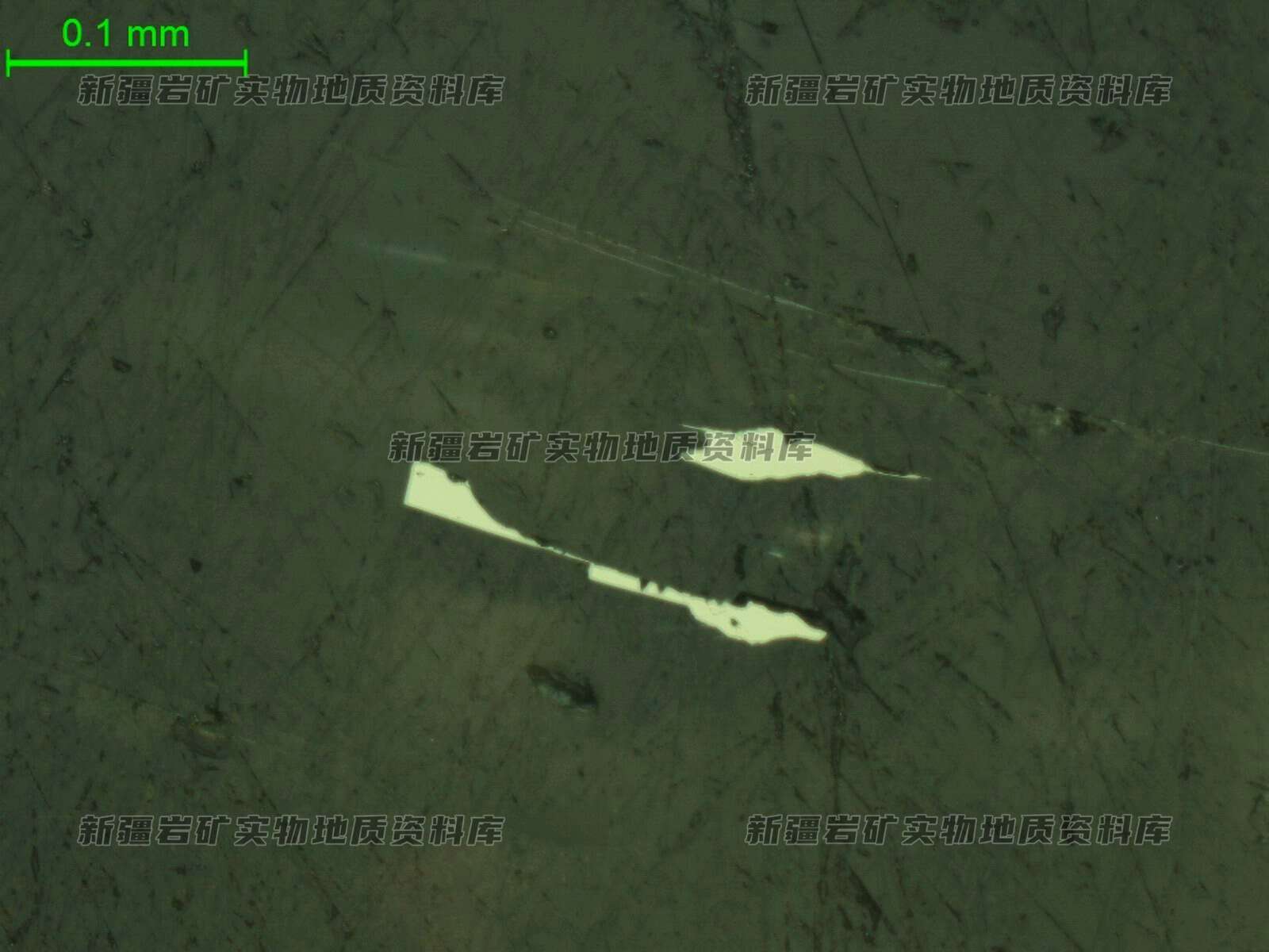 在光片中可见磁黄铁矿呈长条状、他形填隙状分布在透明矿物粒间。