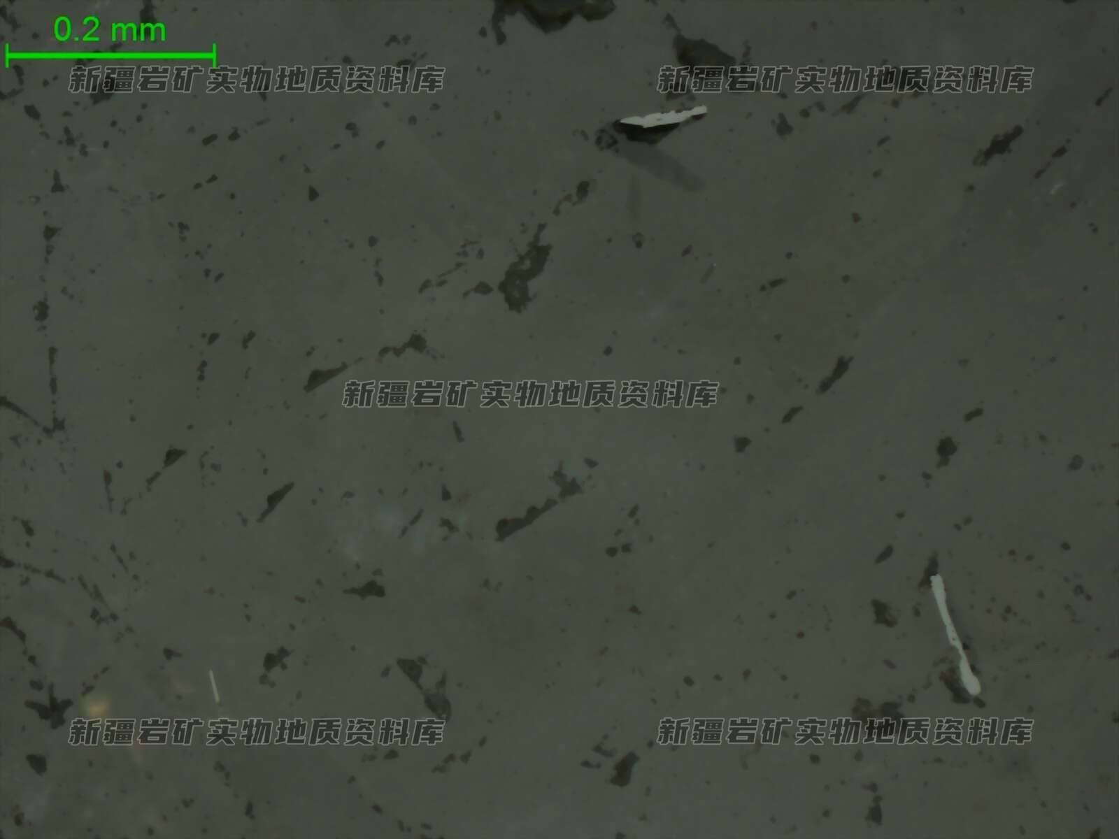 岩石特征描述: 光片中可见金属矿物种类较单一,主要为铌钽铁矿,单晶状零星分布在透明矿物之间,呈半自形粒状、自形针柱状,反射色呈灰色,粒径多在0.01-0.4mm,含量约1%。