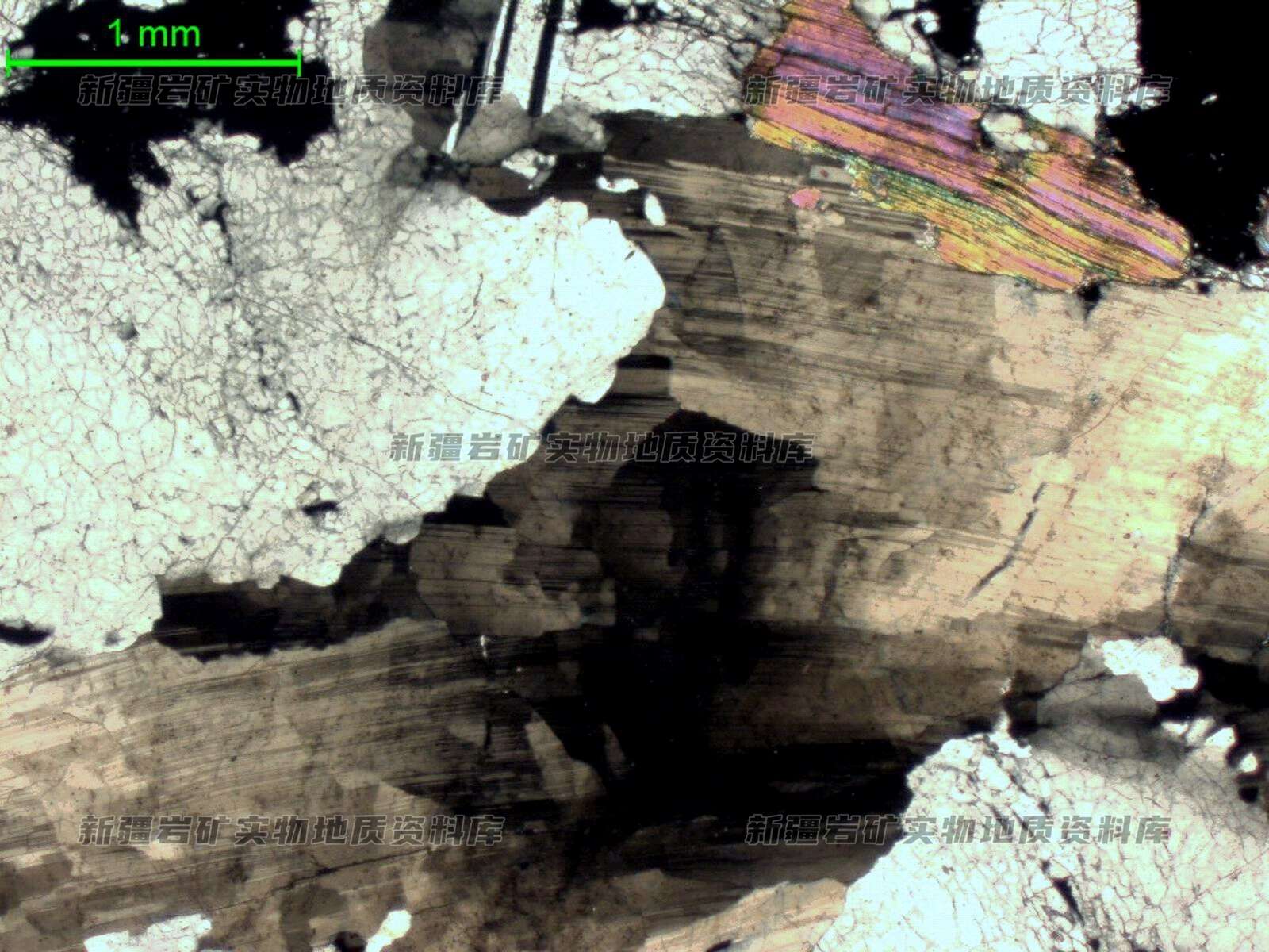 主要矿物及含量%: 薄片中可见岩石主要为长英质矿物,钠长石聚片双晶发育,受应力作用发生弯曲变形,石英多裂纹,波状消光发育,其间分布少量云母,应为锂云母。