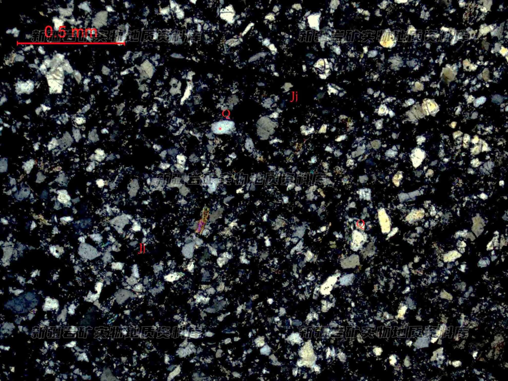 岩石特征描述: 岩石由长石、石英砂屑及胶结物构成,石英屑(Q)次圆状、圆状,粒径细,长石表面具泥化现象。胶结物(Jj)为泥硅质,镜下已变为绢云母隐晶质石英集合体。