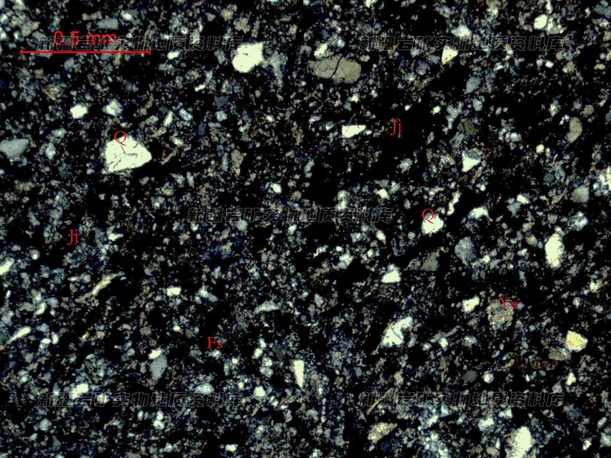 岩石特征描述: 岩石主要由长石、石英砂屑(Fs)和胶结物(Jj)构成,其中,含较多碳质(Tz)碎片。长石、石英屑次棱角状、次圆状,粒径细,长石表面具绢云母化现象。